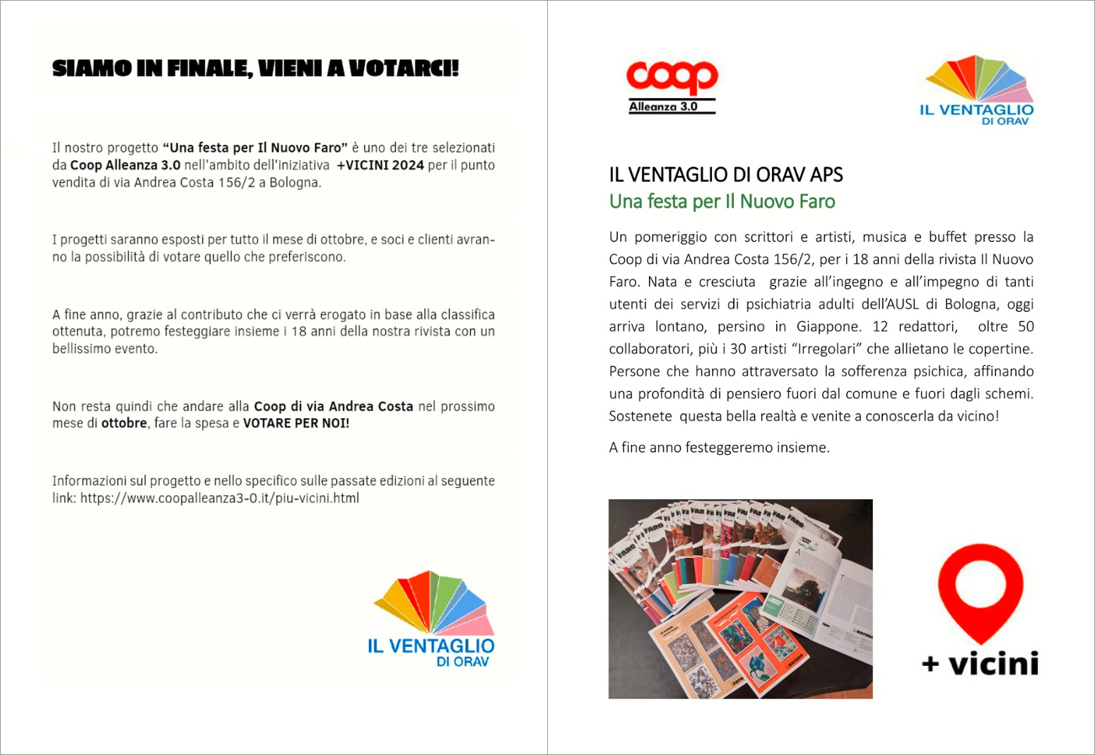 La rivista Il Nuovo Faro compie 18 anni! Per sostenerlo si può votare il progetto "Una festa per il Nuovo Faro", uno dei tre selezionati da Coop Alleanza 3.0 nell'ambito dell'iniziativa +vicini 2024 per la Coop di via Andrea Costa 156/2 a Bologna.